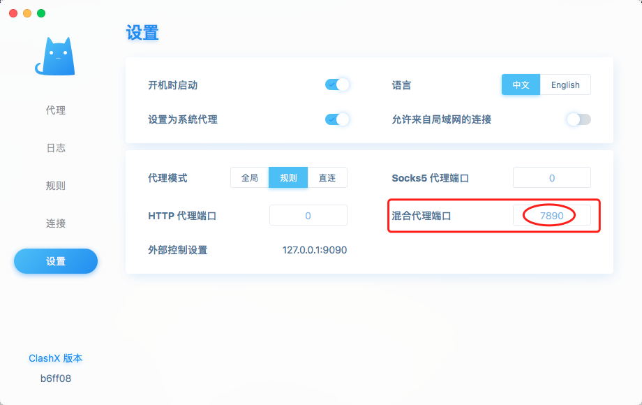 3.记下混合代理端口号,本例为7890