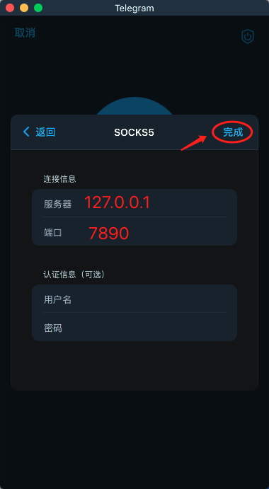 7.在服务器中输入“127.0.0.1“,端口输入刚才从ClashX得到的端口号“7890“(该端口号为本案例端口,请结合自己的实际情况填写),并点击右上角的“完成“,即可开始使用代理登录你的Telegram账号。
